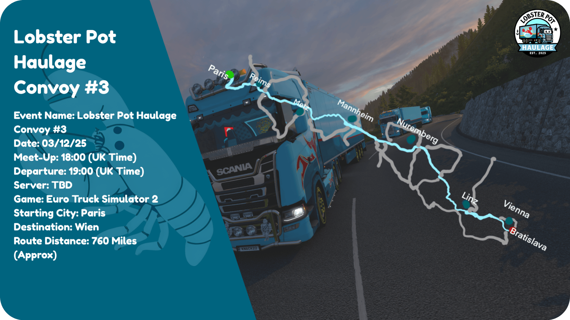 Lobster Pot Haulage Convoy #303/12/2518:00 (UK Time)19:00 (UK Time)Simulation 2Euro Truck Simulator 2ParisWien760 Miles (Approx)