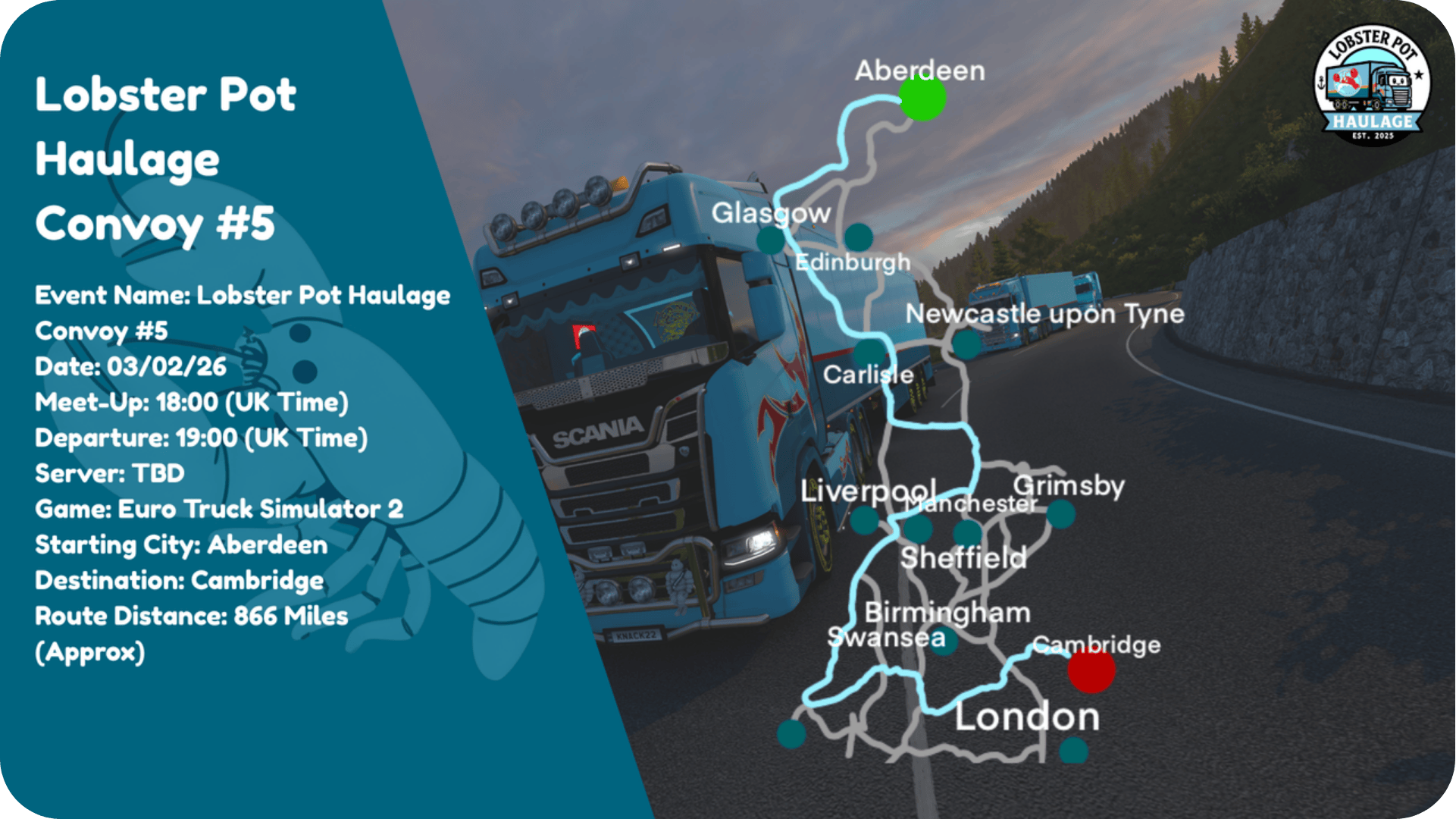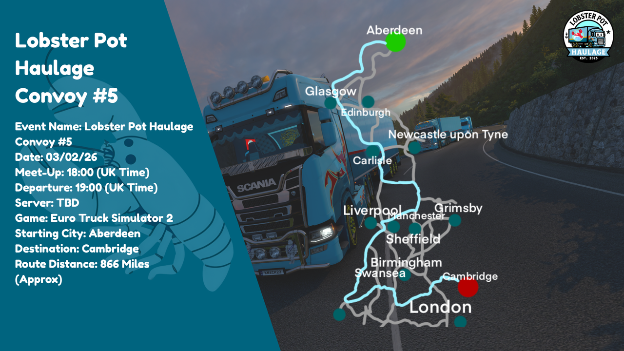 Lobster Pot Haulage Convoy #503/02/2618:00 (UK Time)19:00 (UK Time)Simulation 2Euro Truck Simulator 2AberdeenCambridge866 Miles (Approx)