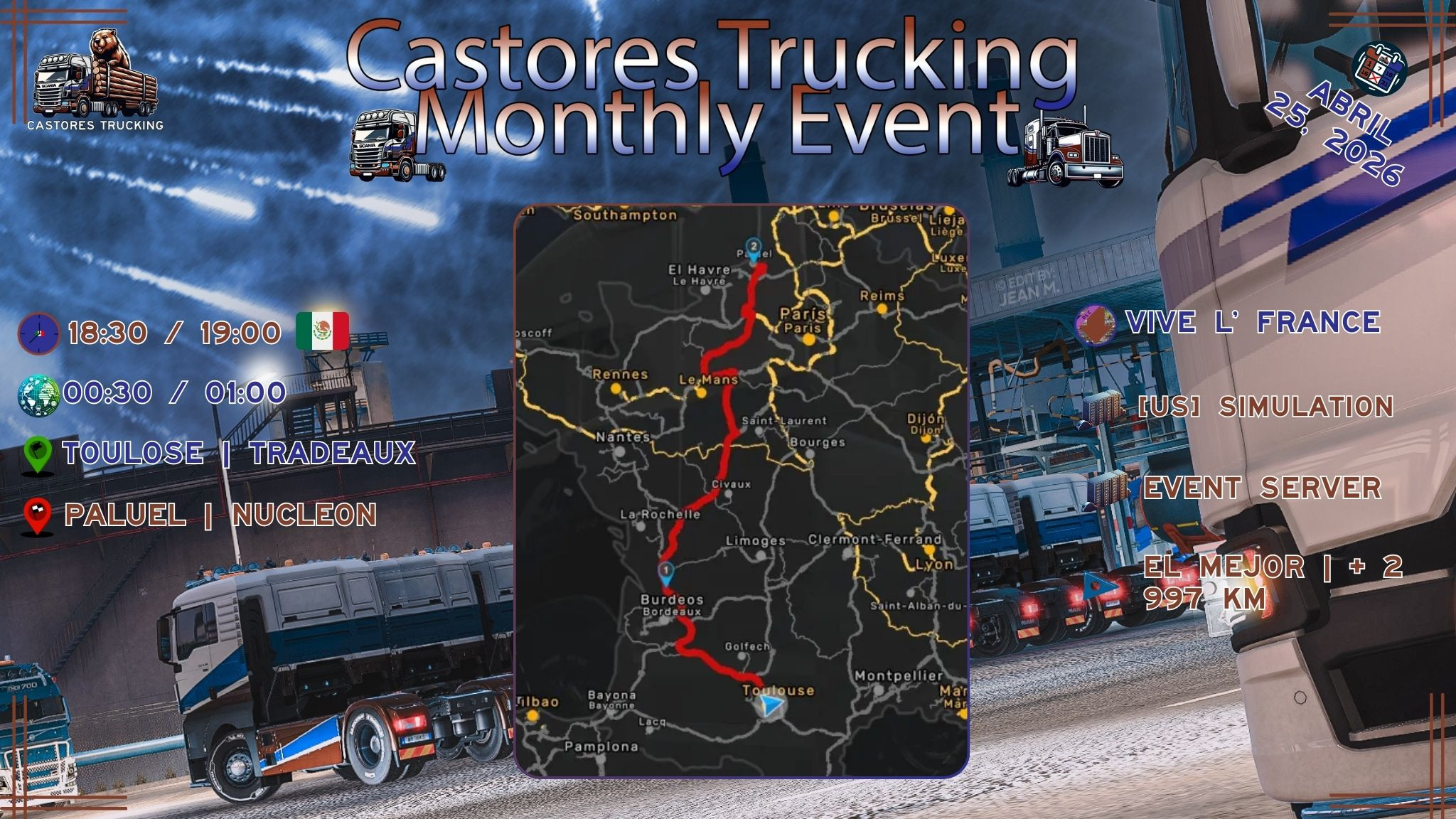! CASTORES TRUCKING; te invitan a Castores Trucking |Monthly Event¡Hola a todos! Castores Trucking se complace en invitarte a nuestro Monthly Event de Abril, un emocionante recorrido por las carreteras europeas en Euro Truck Simulator 2, Este evento sera supervisado por nuestro equipo de Castores Event, junto con la participación de nuestras VTC aliadas y la comunidad global.