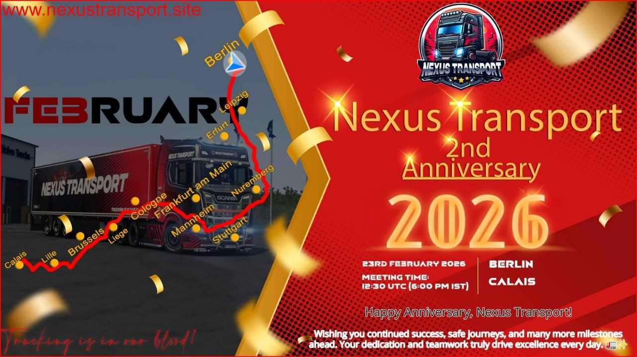MONDAY 20 FEB 2026 12:30 UTC (6:00 PM IST)BERLIN [Slots]CALAIS [PORT]TBD1,255 KmNoneBERLIN 12:30 UTC (6:00 PM IST).13:30 UTC (7:00 PM IST).NTVTC >Partner VTC > Other VTCs > Public.BERLIN to CALAIS,Discord VC during the convoy.truck is fueled and in good condition to start the convoy.YES