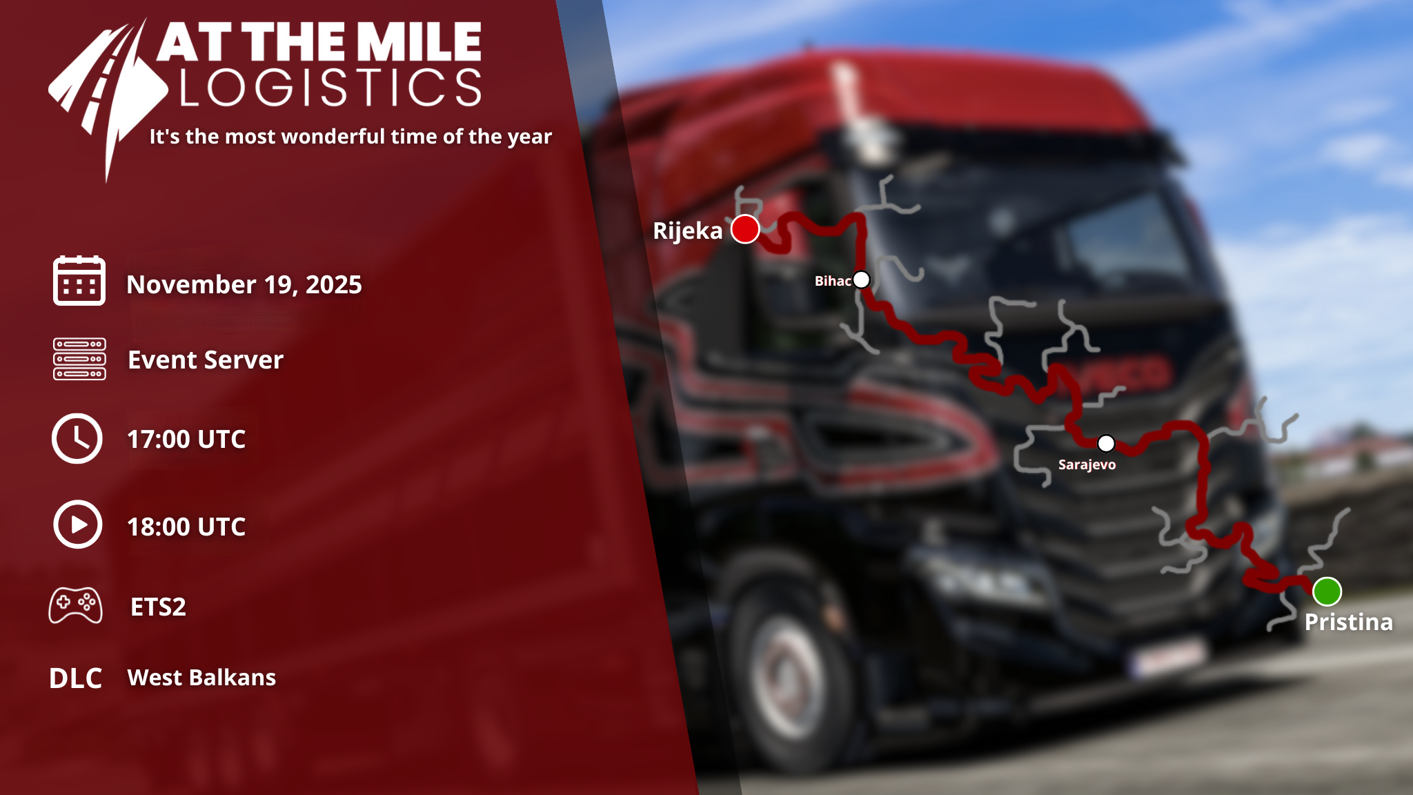 At The Mile Logistics was originally launched on May 24, 2021 with the purpose in being a fun, friendly, relaxed, and professional VTC. We also have a lovely community where everyone can enjoy and relax while playing our favorite games. We invite you all to come and see what we offer as a community and VTC. We hope you join us in our adventure and enjoy this convoy!