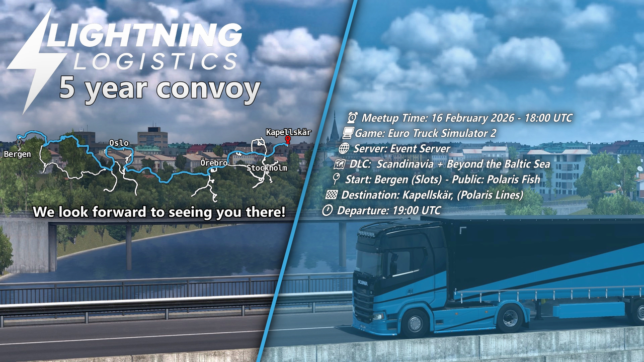 Hello truckers, our 5th-year anniversary will be held on the 16th of February 2026. February is a month of celebration during which we have a fun and great time. We hope you have an amazing drive and experience in our 5th-year convoy! I'll provide information about our convoy below.