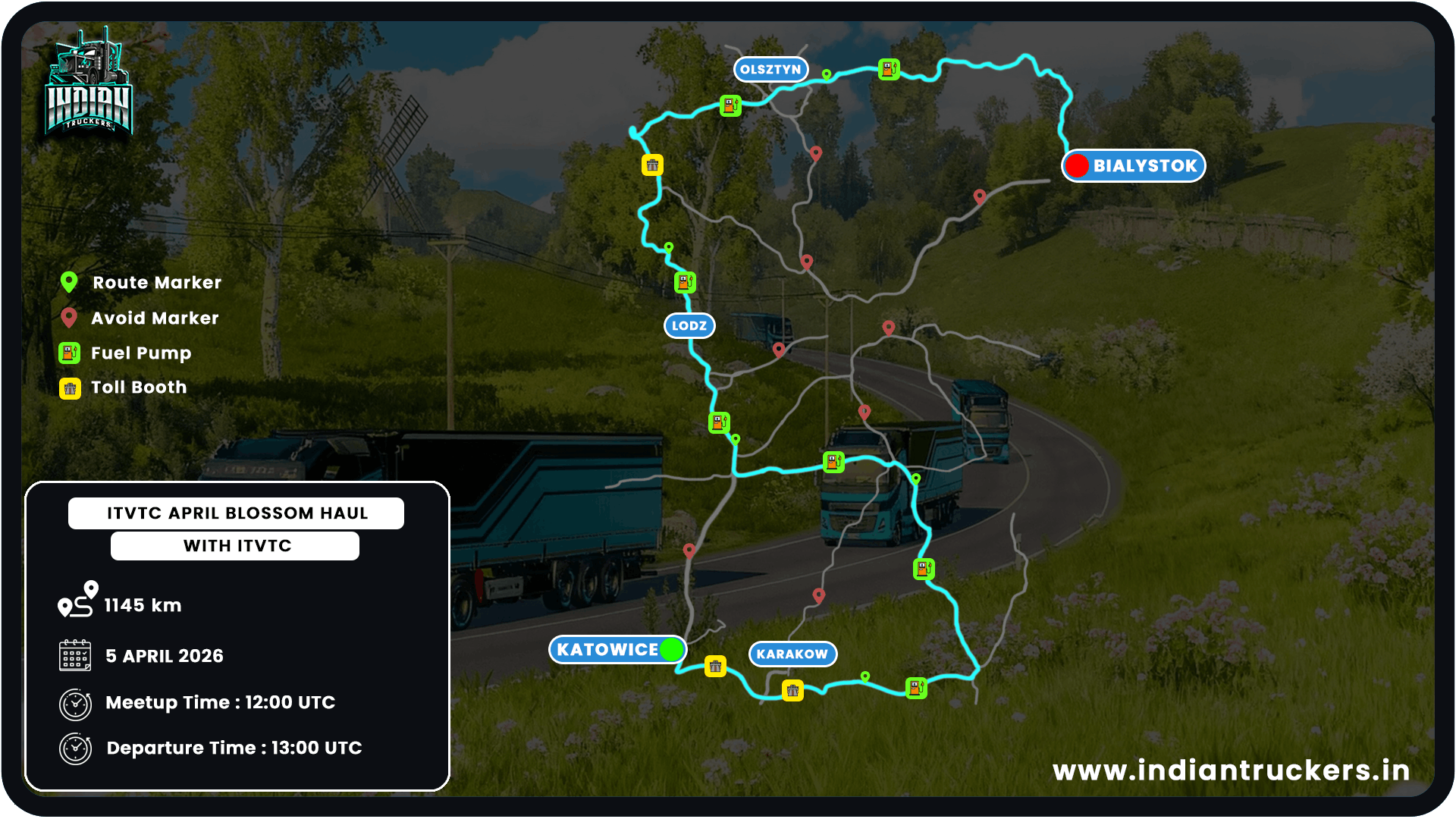 Hello VTC Owners / members. Hope you are doing well. We are going to conduct our ITVTC April Blossom Haul: Rolling Into Spring – Public Convoy #64 in ETS-2 on 4th April 2026. We would like to request you to participate in the event and trucking together. Kindly have a glance at all the details provided below, for any queries our event team and support team is always ready to help you. We will be awaiting your presence. See ya on the road