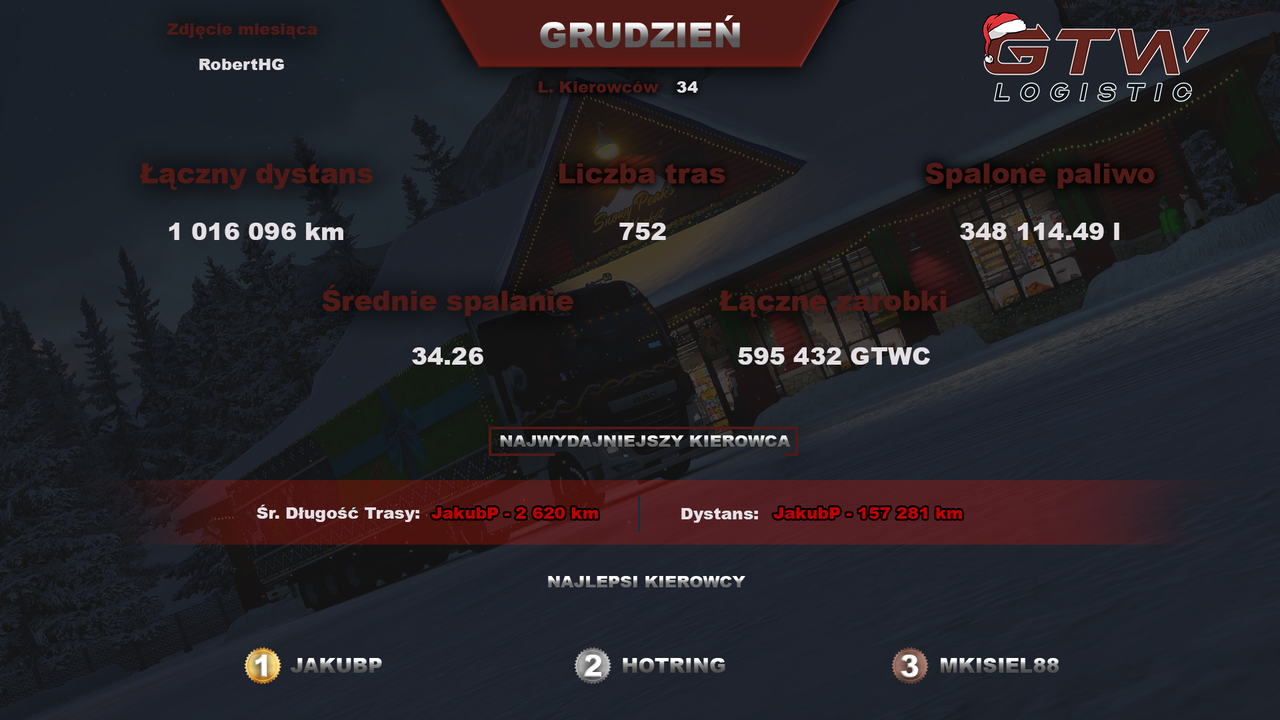 The last month of 2025 is behind us. Despite work and preparations for the holidays, we didn't give up and continued to cover even more kilometers on virtual roads. In December, our drivers delivered 752 deliveries to our customers. The total number of routes covered totaled 1,016,096 kilometers. The most efficient driver was our Boss JakubP, who drove 157,281 kilometers, with an average route distance of 2,620 kilometers.