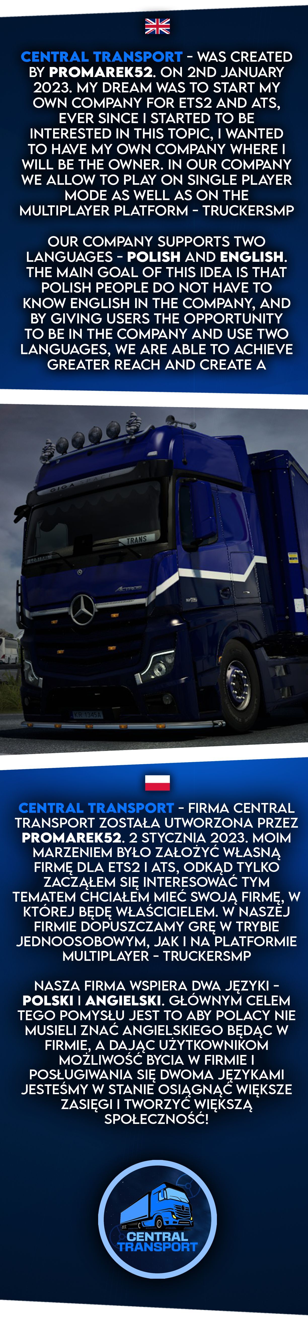 The big moment has arrived! With the joint efforts of all the Drivers and the Management, we have achieved what we have been working for from the very beginning of our existence. Namely, we have succeeded and today, on behalf of the entire company management, it is my pleasure to officially announce the following, that Central Transport is the first company in Poland which has achieved the status of verified company on the platform TruckersMP! This is the highest possible certification for VTC on TruckersMP and it is not easy to achieve, we had to meet a number of requirements and pass a check by members of the TruckersMP team. New horizons are opening up for us, and most importantly, our company will be high up on the lists with its name highlighted in red and with the verification mark. This is a very important distinction for us which motivates us to move forward - we are planning to expand our team and develop the events sector with our own large convoys with other VTCs - and this is coming soon. On behalf of the founder of the company promarek52 I would like to thank Developer Ebukchali for creating our technical sector: website and bot**, MalekG who is promoted to Event Manager for his work on events, and the Community Team consisting of Black.Knight and Fami_Naklejka for taking care of our posts on the TMP website. Thank you also to all the patrons, supporters, activists and everyone involved. Thanks also go to you - our wonderful drivers, if it wasn't for you, we wouldn't exist. Thanks to your hard work and dedication to the company, the road to success is much easier.