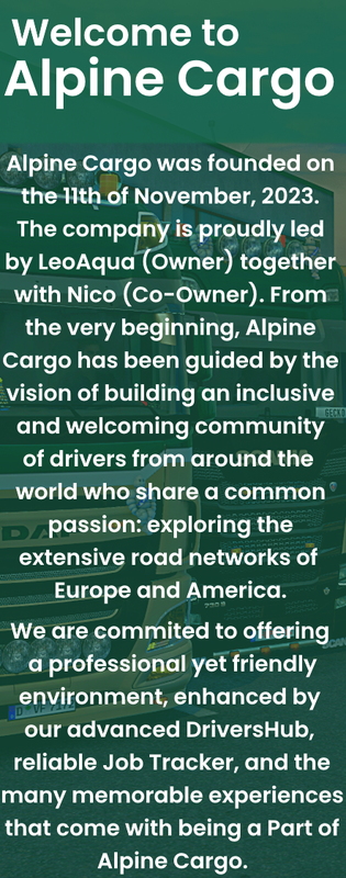 Our VTC just reached 40 drivers! We are happy that Alpine Cargo is growing. It took us a long time to bring the company to this level. Lots of strength, ideas, but also moments when we wanted to cut it short. Thank you for your support! we wouldn't be where we are without you. I hope that we will continue to grow like this, and the functionality of the company will continue to improve. We are sure to have many more news to inform you about! Thank you all!